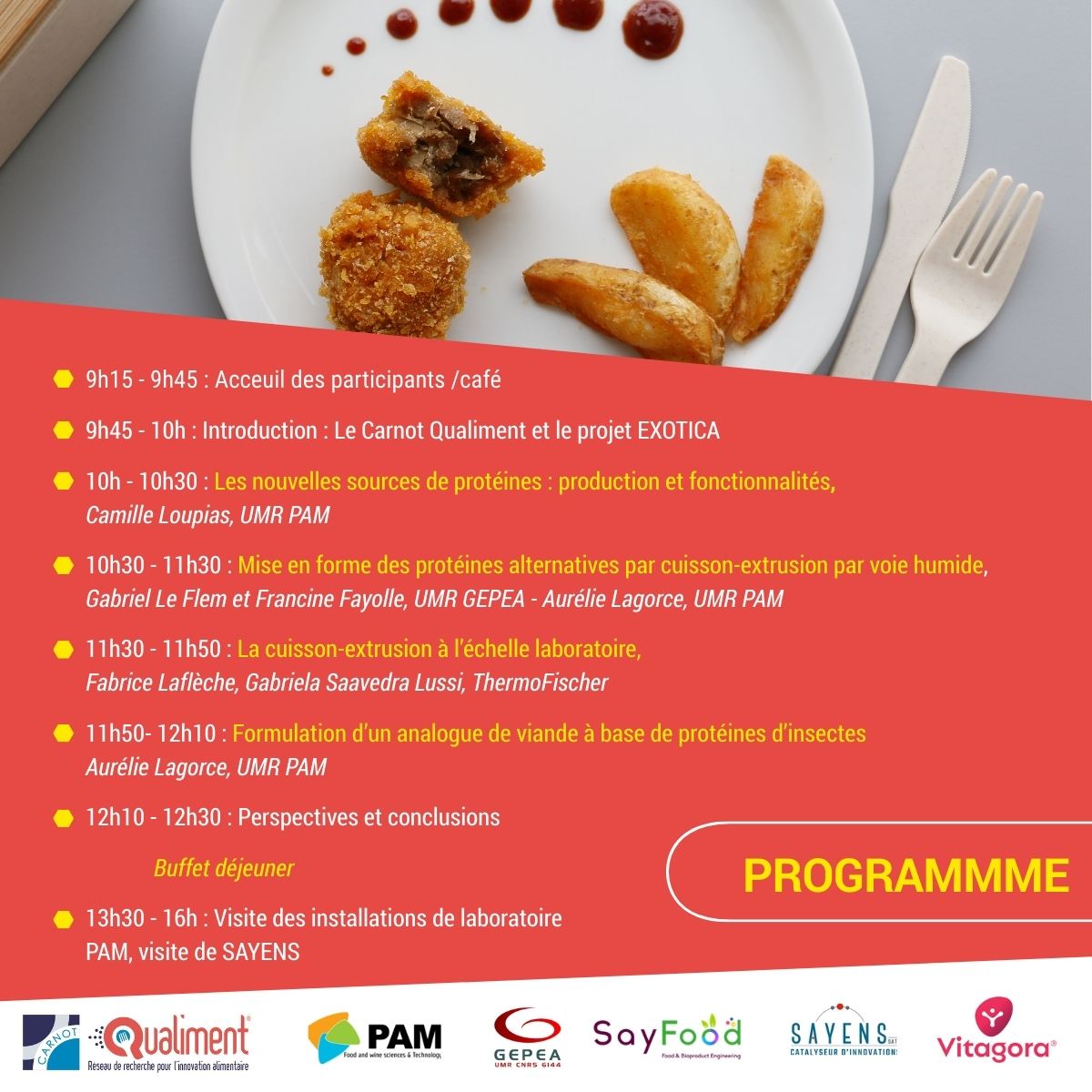 Mené conjointement par plusieurs unités du Carnot Qualiment (PAM, SAYFOOD, GEPEA et SAYENS), le projet EXOTICA explore les potentiels des protéines issues d’insectes et de microalgues pour le développement d’alternatives durables et fonctionnelles.